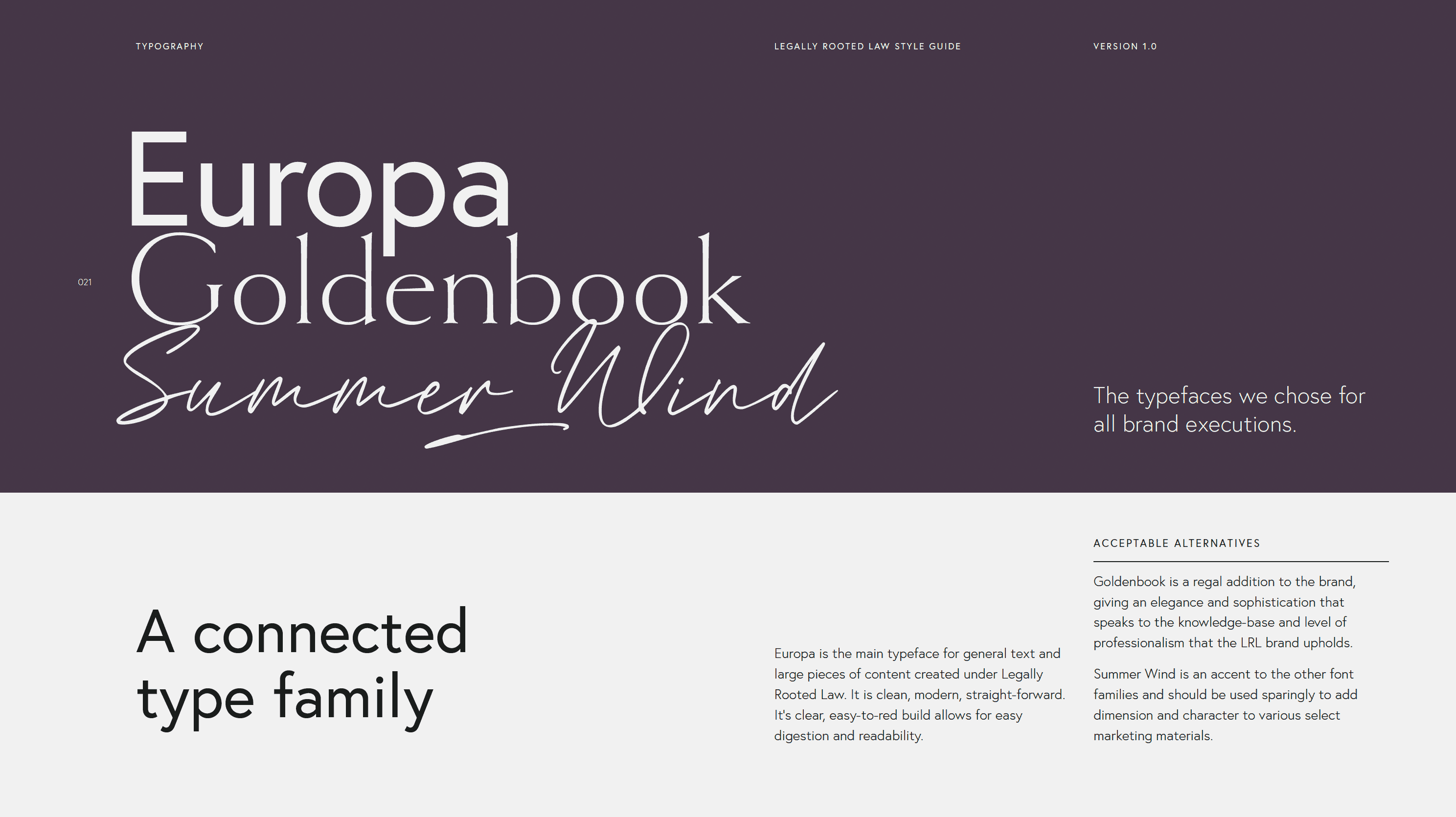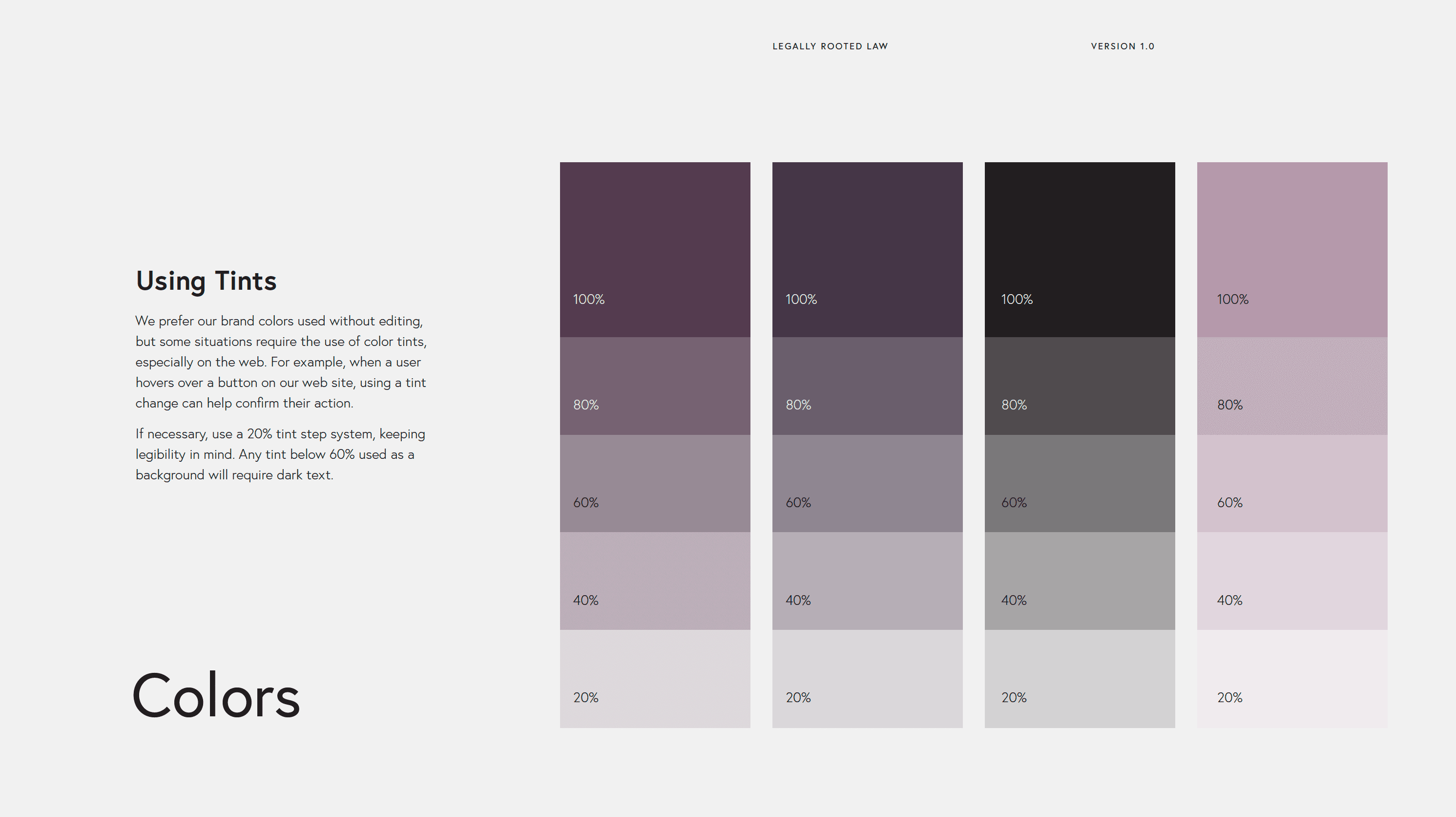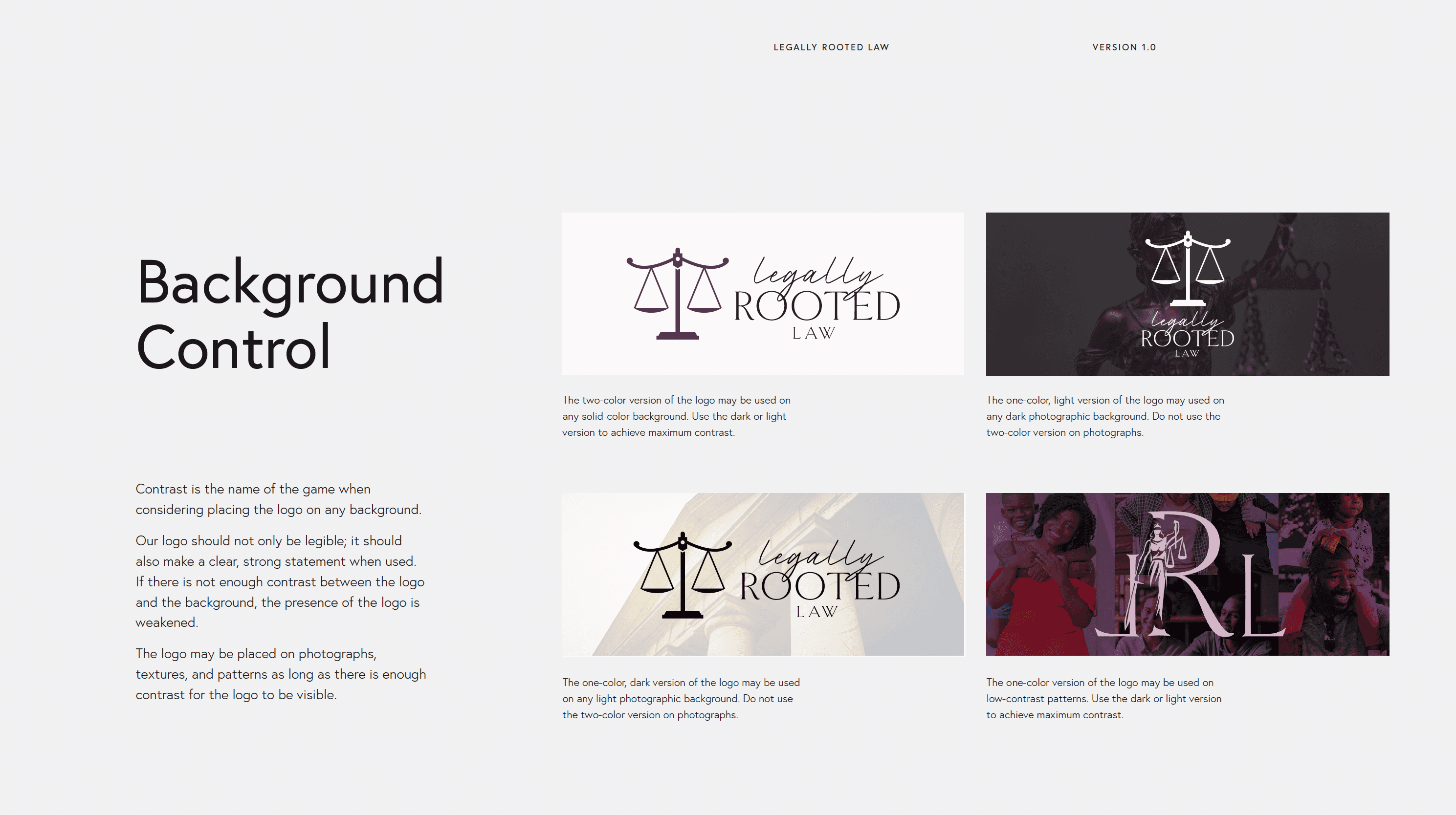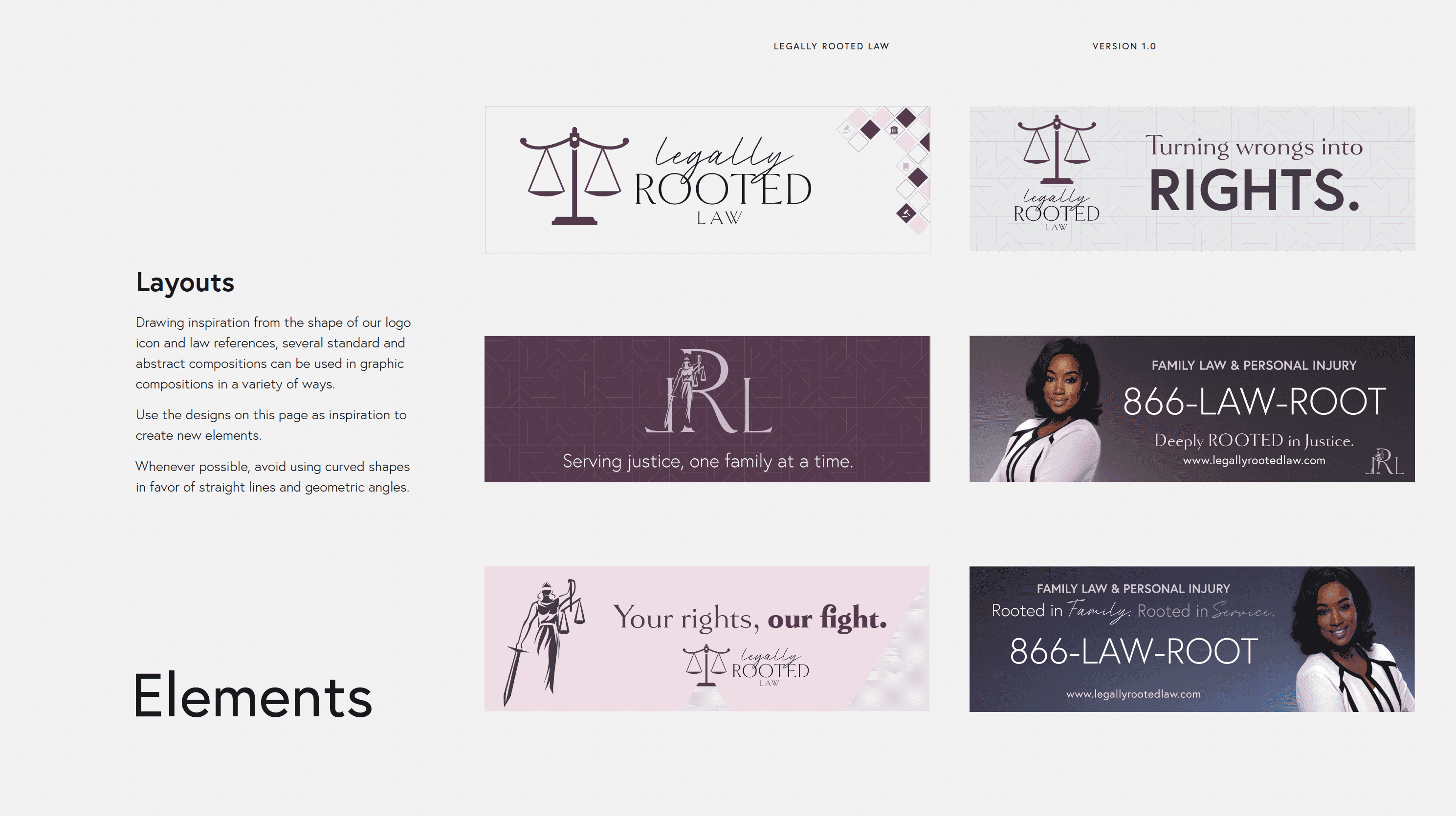 Legally Rooted Law was a full brand identity design. This project included logo design, color guidelines, typography, visual imagery, graphic assets, messaging, and copywriting.