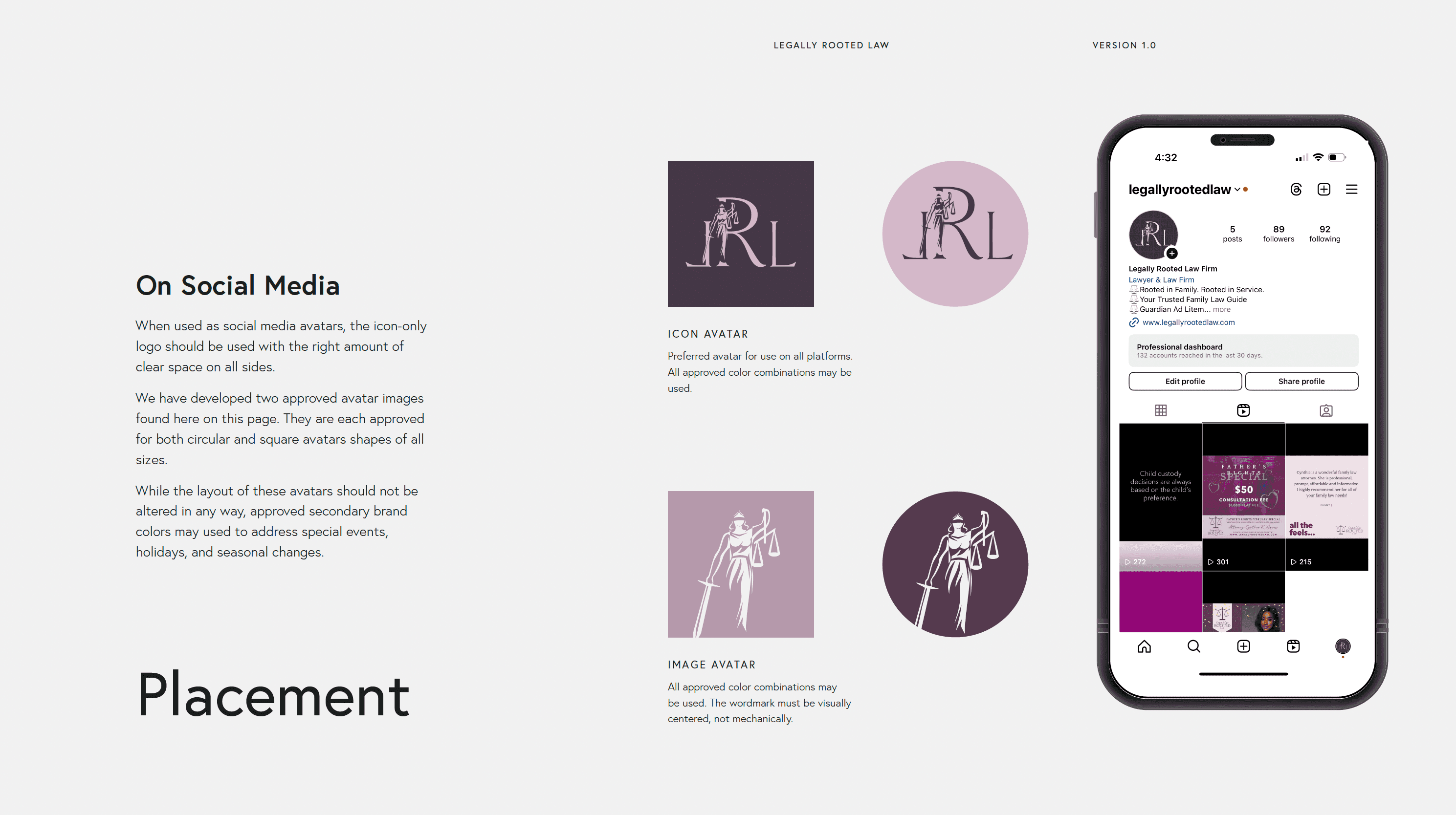 The final identity clearly positions Legally Rooted Law as a trusted, values-driven practice. The cohesive visuals and messaging differentiate the firm from colder, transactional competitors, giving her a memorable, meaningful brand built to grow with her practice.