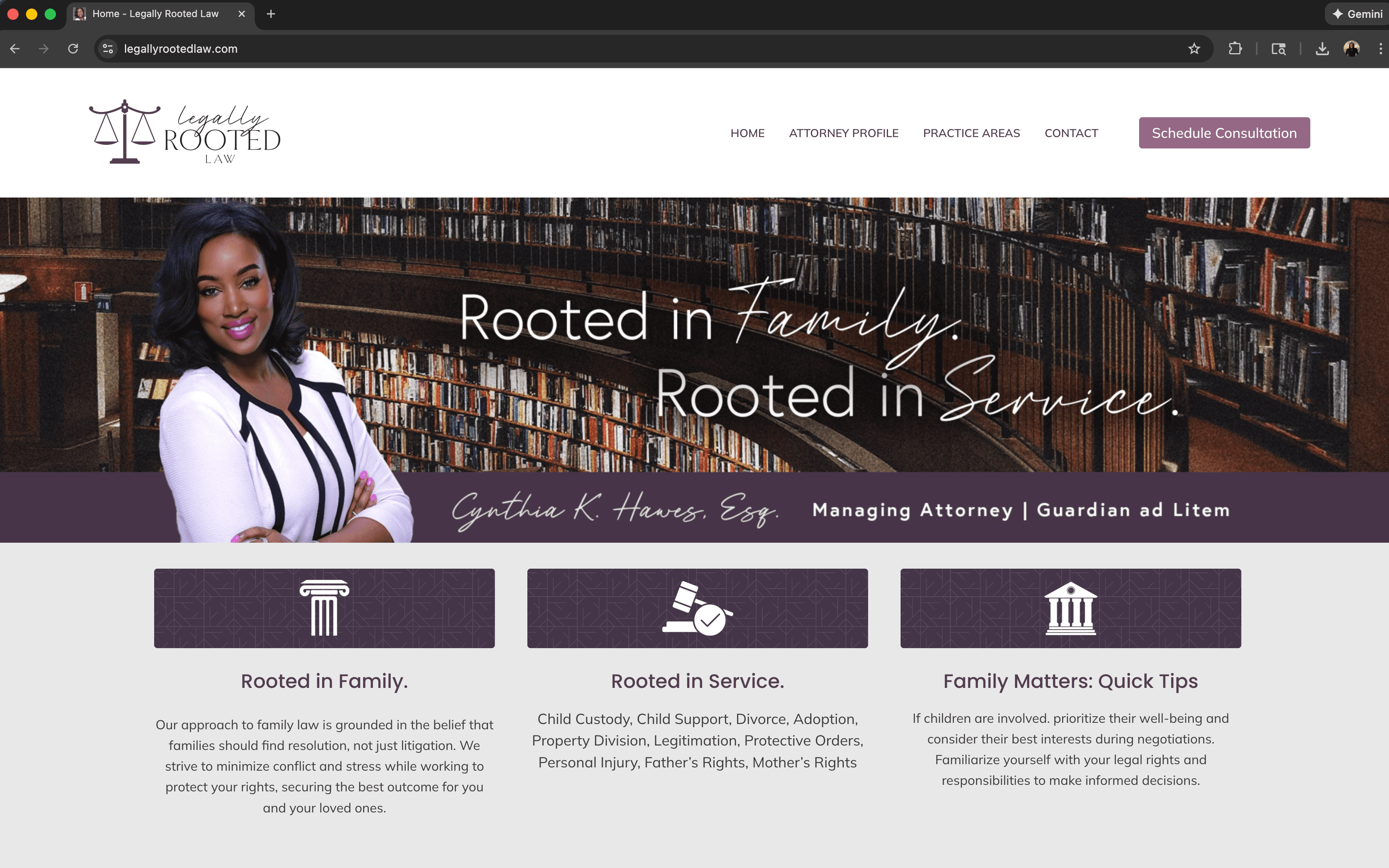 An independent attorney launching Legally Rooted Law needed a brand that felt grounded, trustworthy, and distinct from traditional family-law firms. The challenge was to communicate her values—family, service, and justice—while positioning her as a compassionate yet capable partner for clients in transition.